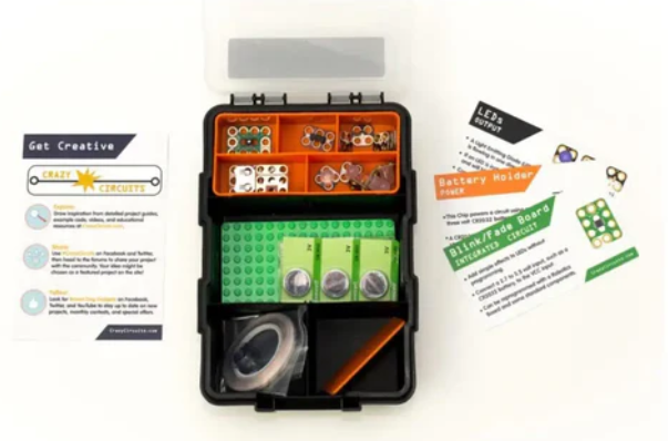 The Crazy Circuits Starter Kit teaches you circuits, programming, logic, engineering, sewing, art, and design. Design your own products from scratch or follow one of our many build guides. You can also add Crazy Circuits parts to your LEGO products to light them up. Simply use special Maker Tape and press Crazy Circuits parts into place. Use the included conductive thread to create eye-catching wearables. Crazy Circuits parts are compatible with LEGO and similar building systems. Crazy Circuits parts are ready to use right out of the box, no soldering required.