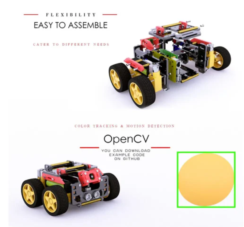 기능에는 물체 인식, 추적, 운동 감지 - OpenCV 기반이므로 특정 형태 또는 색상의 물체를 추적할 수 있습니다.또한 적외선 반사에 기반한 회선 추적 기능을 제공하므로 사용자가 설정한 경로를 따라 걸을 수 있습니다.실시간 비디오 전송 기능을 제공하므로 Raspberry Pi 카메라로 찍은 실시간 이미지를 원격 컴퓨터로 전송할 수 있습니다.APP를 통해 원격으로 제어할 수 있으므로 키보드의 버튼이나 GUI의 가상 버튼을 통해 로봇을 원격으로 제어할 수 있습니다.6x WS8212 직렬 RGB LED를 장착하고 있으며, 이 RGB LED는 GPIO 핀만 있으면 제어할 수 있으며, 다양한 색상을 변경하고 로봇의 작동 상태를 표시할 수 있다.또한 Raspberry Pi 로봇을 단계적으로 조립할 수 있는 그림이 포함된 인쇄 매뉴얼과 64페이지 PDF 매뉴얼도 포함되어 있습니다.h