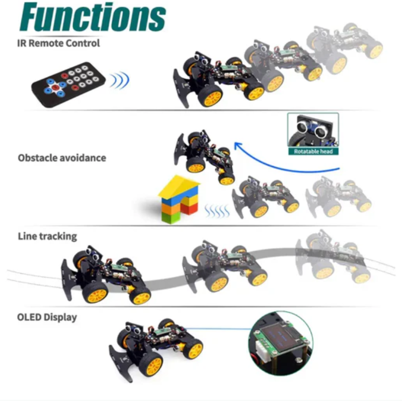 Multiple control methods: infrared remote control, obstacle avoidance, line tracking, etc. Smart cars use servo motors to control steering, which is closer to the mechanical structure of real cars. This kit comes with an ESP8266 Wi Fi module, which you can program through an app to control this smart car.