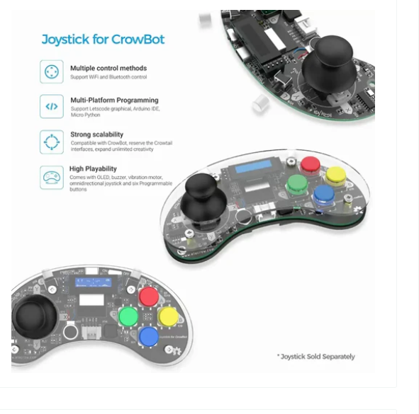 CrowBot BOLT - Open source programmable intelligent robot car STEAM robot kit (with joystick handle) is an innovative intelligent programming vehicle driven by ESP32 chip. The device is equipped with various sensors, including optical sensors, ultrasonic sensors, and line tracking sensors. It also has WiFi and Bluetooth capabilities, making it a versatile tool suitable for various programming environments such as Letscode, Micropython, and Arduino.