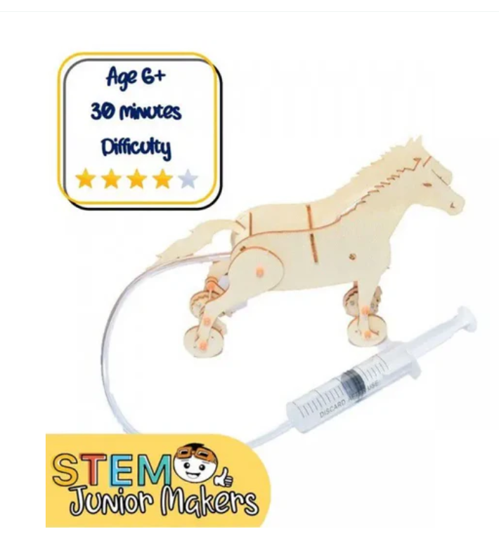 The Cytron DIY Wooden Pneumatic Horse Kit is an engaging and educational assembly kit designed specifically for children aged 6 to 12. This kit provides children with the opportunity to participate in practical activities while observing the movement of the wooden horse, simply by pushing and pulling the syringe. This action illustrates the principles of pneumatic and aerodynamic systems in a fun and interactive way.