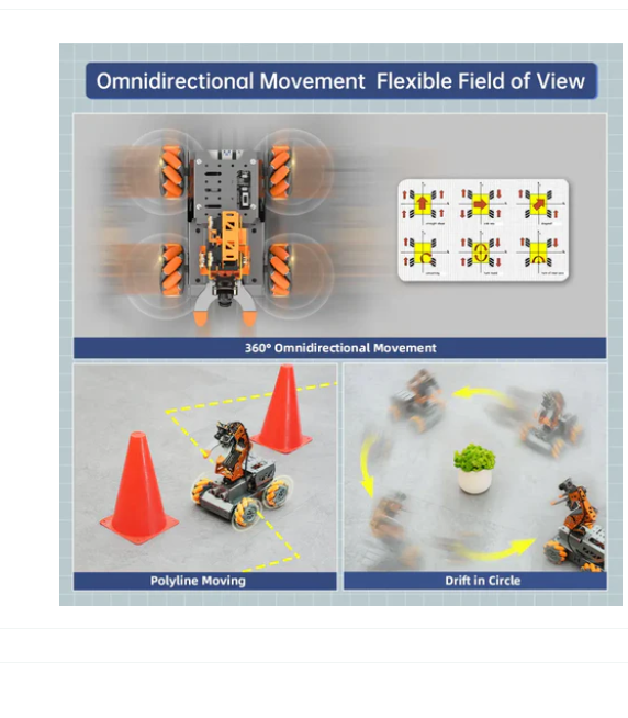 The MasterPi is equipped with four universal Mecanum wheels that can rotate 360 °, allowing it to boldly challenge various complex tracks with multiple sports modes (forward, horizontal, diagonal, and rotary) and excellent performance.