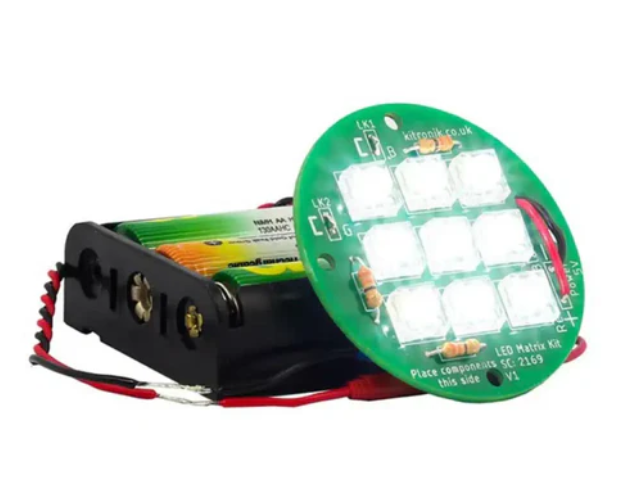The Kitronik Round 5V LED Matrix Light Kit is a small and easy to assemble kit. Provides very bright light. The unit comes with 9 white super flux LEDs with a total output of approximately 16,000mCd.