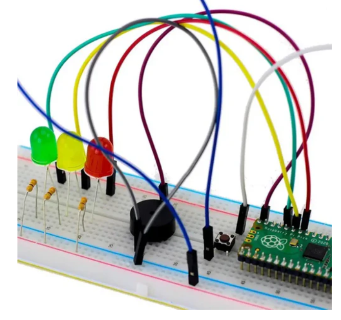 The kit contains a large breadboard. Contains all the parts needed to conduct the 7 experiments. The kit comes in a sturdy, reusable packaging for easy storage. This version of the kit does not come with a Raspberry Pi Pico.