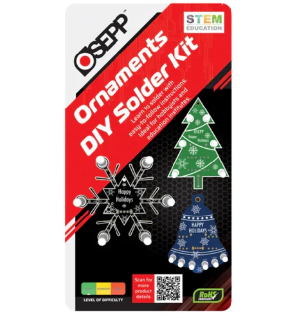 • OSEPP Holiday Ornaments DIY Soldering Kit includes 3 different holiday ornaments and a multi-color cycling RGB light.