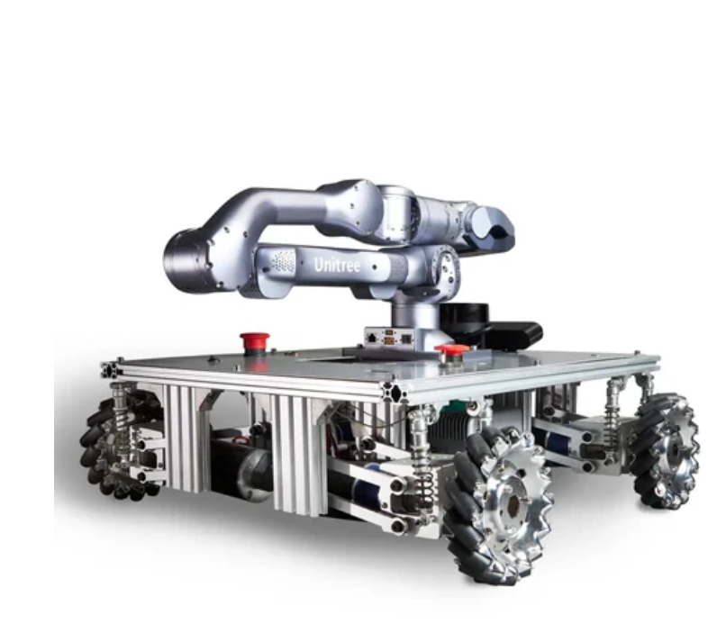 Pickerbot Pro에는 내장형 Z1 Pro Unitree 암, ROS 컨트롤러,LiDAR、심층 카메라, STM32 모터/전원/IMU 및 전방향 맥넘 휠이 장착된 금속 섀시