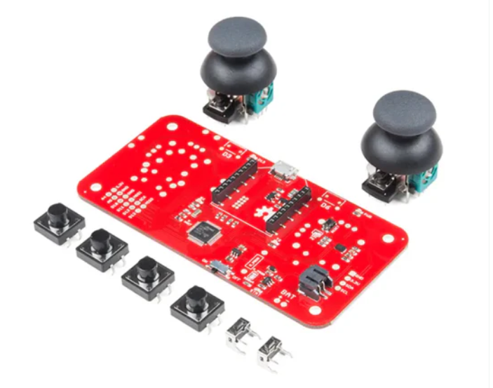 The kit comes with a SAMD21 and requires assembly and the addition of an XBee and Li-ion battery in the provided socket. It can be configured with dual joysticks for enhanced remote control steering, suitable for robots such as tanks, or with a single joystick and four 12mm momentary buttons, reminiscent of old-school game consoles. The kit includes a built-in LiPo charging IC (MCP73831) and a fuel gauge (MAX17043). Comprehensive assembly instructions and a tank steering motor controller tutorial are provided to assist the user.