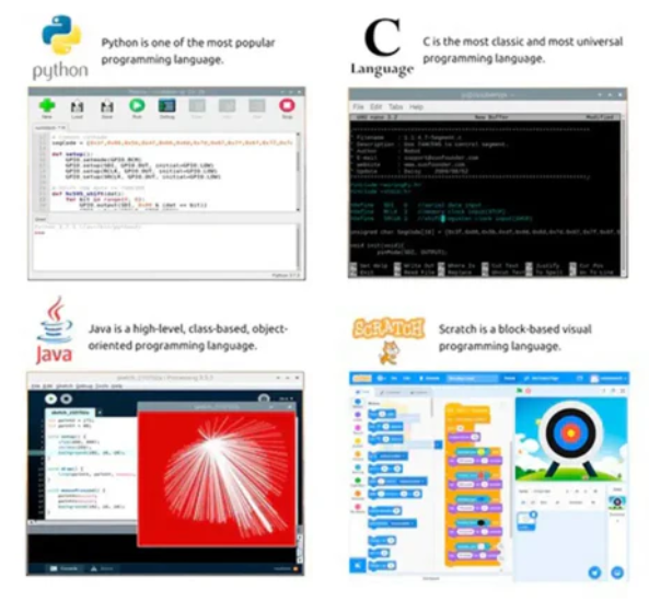 이것은 Raspberry Pi 400 4B/3B+/3B/3A+/2B/1B+/1A+/Zero W/Zero와 호환되는 Raspberry Pi 스타터 키트입니다. 여기에는 전자공학과 응용 프로그래밍을 배우는 데 필요한 300개의 구성 요소가 포함되어 있습니다. SunFounder Da Vinci Raspberry Pi 스타터 키트에는 Python, C, Scratch, Nodejs, Java(Processing System)의 4가지 프로그래밍 언어가 포함되어 있습니다.