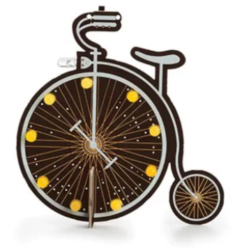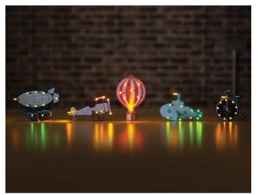 The second kit is designed in the shape of a Jules Verne-style bicycle and can also be hung using the small mounting holes on the top or stand alone. It features a unique brown print and comes with multiple yellow LED lights, and a warm candle-flashing LED light on the top.