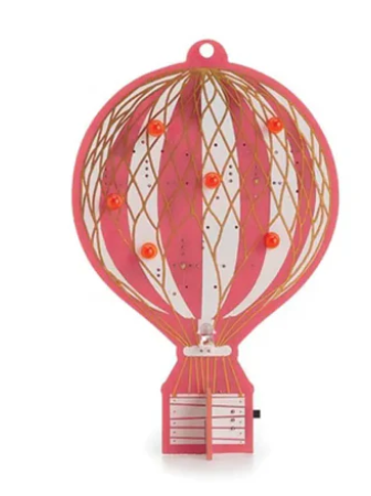 The first kit is designed in the shape of a Jules Verne hot air balloon and can be hung using the small mounting holes on the top or stand alone. It features a unique orange-red print and comes with multiple orange LED lights, and a warm candle-flashing LED light in the center.