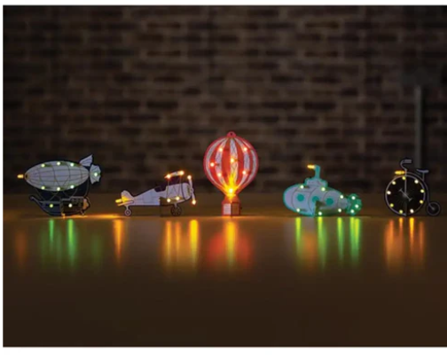 This particular kit features a Jules Verne-style biplane shape and can be hung from the small mounting holes on the top, or it can stand on its own. This biplane is one of five retro soldering kits, perfect for beginners or advanced collectors.