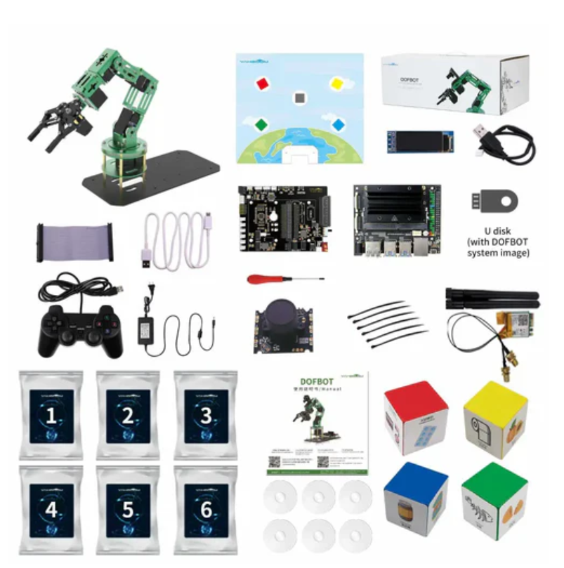 Yahboom 6-degree-of-freedom AI visual robotic arm with ROS and Python programming, suitable for Jetson NANO 4GB (including Jetson NANO SUB board). The English manual is the perfect partner for AI beginners, programming enthusiasts, and Jetson nano fans. It is based on the Jetson NANO 4GB design and includes 6 high-quality servers, a high-definition camera, and a multifunctional expansion board. The entire body is made of green alumina alloy, which is both beautiful and durable. Through the ROS robot system, the motion control of serial bus servo has been simplified. Using open-source CV as an image processing library and Python 3 programming language to create a series of AI visual games, such as color tracking, color interaction, garbage classification, gesture recognition, face tracking, etc. It can be controlled through Android/iOS mobile apps, PC computers, and game controllers. In addition, tutorials are provided for reference.
