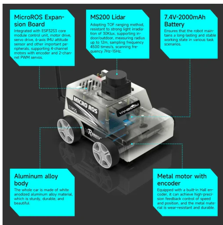 ROS intelligent robot paired with ORBBEC MS200 TOF LiDAR, supports indoor and outdoor mapping navigation, with precise and fast measurement speed; The expansion board integrates ESP32S3 dual core development board, with rich ROS2 driver controllers onboard and built-in peripheral driver firmware programs. Simply connect to the ROS2 environment to use, simple and efficient; 7.4V-2000mAh battery life of 5Hs, MD310Z20 metal encoder motor. HP accessories provide a solid foundation for smooth robot programming