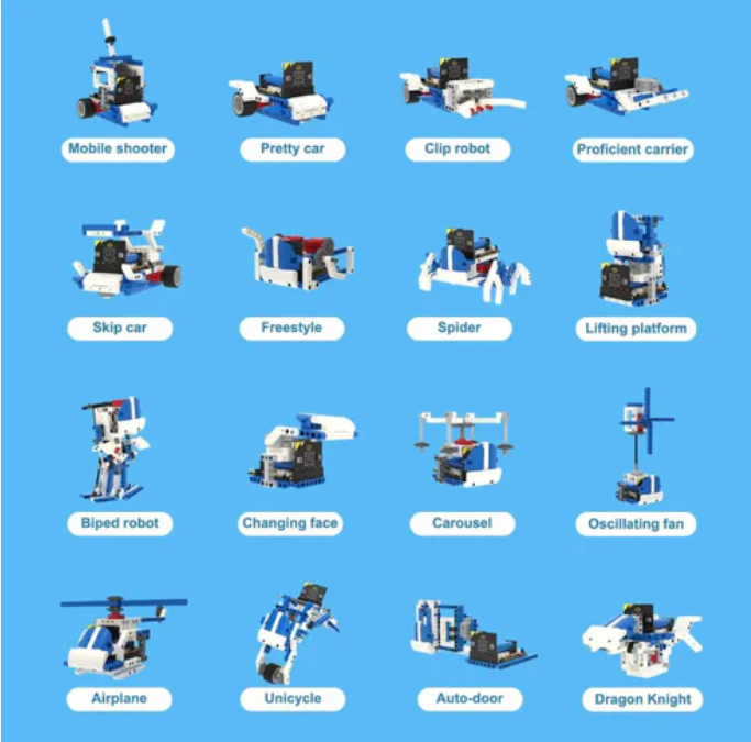 The Super: bit expansion board is designed specifically for BBC Micro: bit and has been carefully crafted to perfectly integrate with building blocks, allowing users to build any shape and drive building block servos, motors, RGB lights, and other devices. The building blocks of this kit are mainly in blue and white colors, with a strong sense of technology, and can be assembled into countless models. The manual contains assembly steps for 16 models and basic programming guidance.