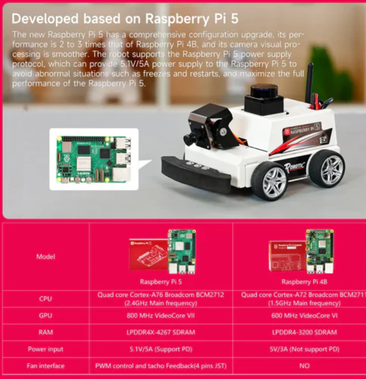 Developed specifically for Raspberry Pi 5, the microROS Pi5 robot is based on the latest Raspberry Pi 5. The difference from previous versions of Raspberry Pi is that this robot needs to solve special power issues in order to fully utilize the performance of Raspberry Pi 5. Meanwhile, this intelligent robot is not compatible with PI 4B, 4, and 3B+. Yahboom suggests choosing a dedicated Pi 5 robot, which has three times the performance of Pi 4 and runs algorithms more smoothly.