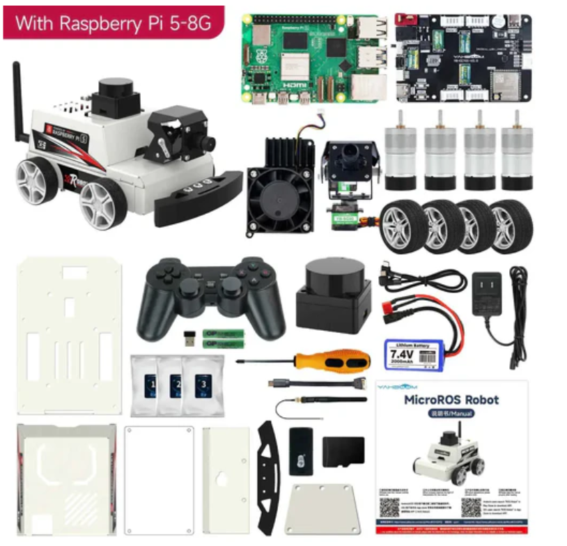 You will receive a programmable robot kit with a metal chassis structure and most components pre installed. It includes an expansion board with onboard ESP co processing, a six axis IMU, 310 encoder deceleration motors, a 7.4V rechargeable battery, Raspberry Pi 5 (depending on version), Pi 5 active heat sink, LiDAR, and 2DOF camera. Combining high-performance hardware with solid electronic course content, including Yahboom's original practical and theoretical courses, technical guidance