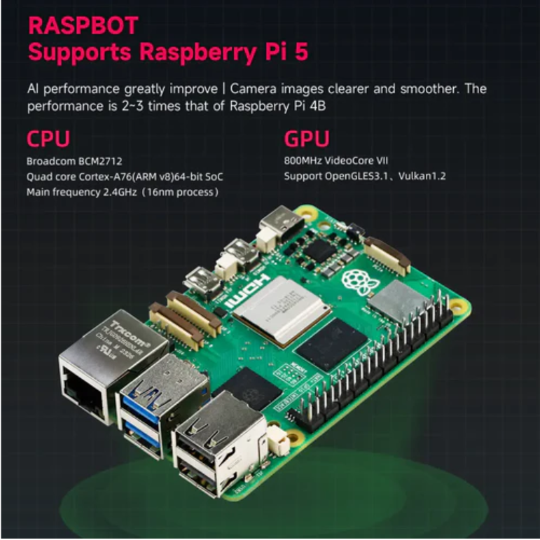 Raspbot은 인공지능 초보자를 위해 설계된 최소 비용으로 인공지능을 학습하는 로봇으로 라즈베리 파이 5 개발판에 적용되며 다기능 확장판을 섀시로 TT 모터 4개, 고화질 카메라 1개, 4채널 추적, 초음파 모듈 등을 장착하여 원격 조종 승용차로 사용할 수도 있고 인공지능 학습 키트로 사용할 수도 있으며 시중에 나와 있는 다른 스마트 승용차와 마찬가지로 일반적인 초음파 추적, 초음파 탐지, Raspe 기능, Raspe 기반 인공 프로그래밍 기능을 통해 인공 경적을 피할 수 있으며 Open Phot 시리즈는 인공지능 프로그래밍 기능으로 제작되어 있다.사용자는 APP, IR, Jupter Lab web을 통해 이 로봇 승용차를 제어하고 FPV 시각 경험을 즐길 수 있다.