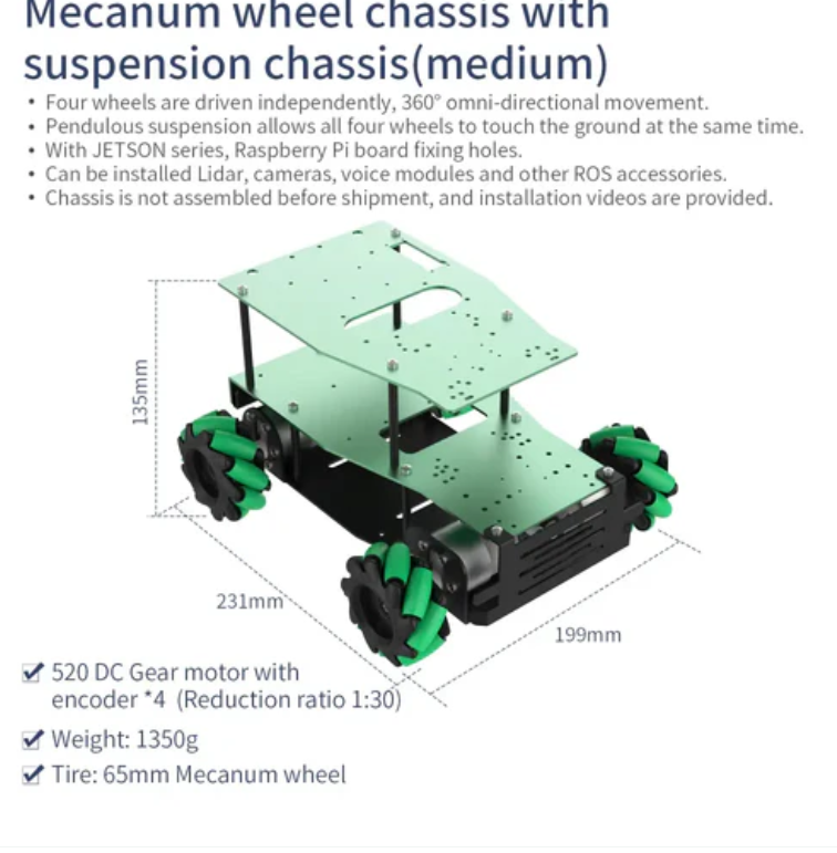 Yahboom 알루미늄 ROS 로봇 차량 섀시-플랭크 서스펜션 맥넘 휠-중형 (EN 수동) 은 플랭크 서스펜션 섀시를 사용하여 모든 네 개의 바퀴가 어떤 지형에서도 지면과 접촉할 수 있도록 한다.이런 설계는 바퀴가 미끄러지는 것을 효과적으로 방지하여 자동차가 서로 다른 유형의 지형에 적응할 수 있도록 하였다.