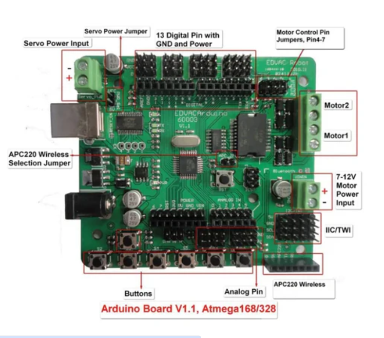 This is a microcontroller board based on Arduino 168. It has 14 digital input/output pins (6 of which can be used as PWM outputs), 8 analog inputs, a 16 MHz crystal oscillator, a USB connection, a power jack, an ICSP connector, and a reset button. It contains everything necessary to support microcontrollers; Simply connect it to a computer using a USB cable or power it with an AC-DC adapter or battery to start using it.