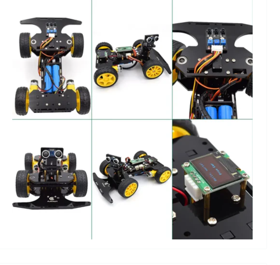 Multiple control methods: infrared remote control, obstacle avoidance, line tracking, etc. Smart cars use servo motors to control steering, which is closer to the mechanical structure of real cars. This kit comes with an ESP8266 Wi Fi module, which you can program through an app to control this smart car.