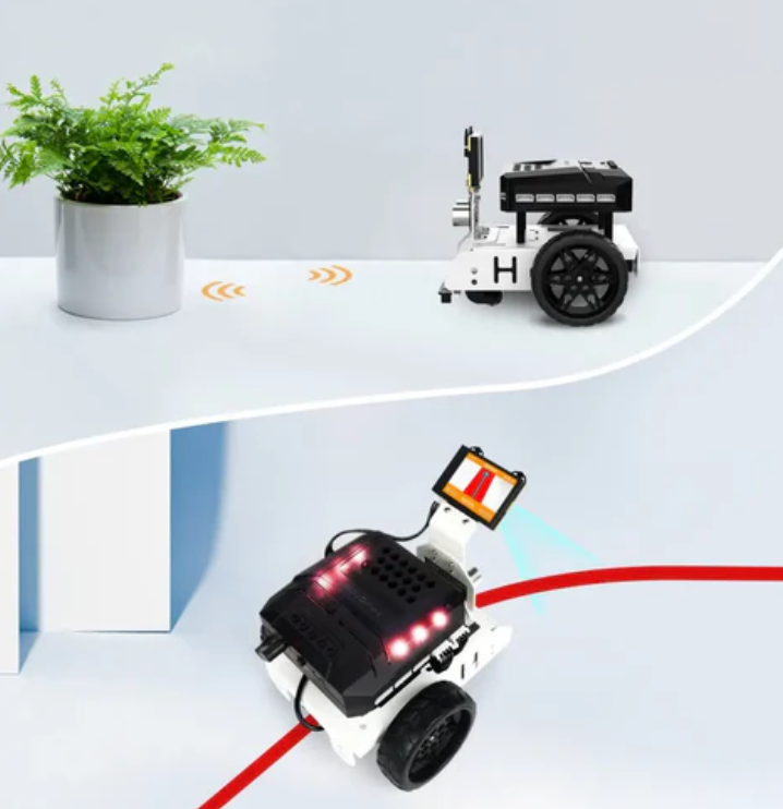 Ainova Vision Robot Car is equipped with Wondercam, Graphic Scratch, and Python programming, and is an AI robot vehicle kit based on graphics and Python programming. It is equipped with a CoreX controller, high-precision encoder motor, 4-channel line tracker, and luminescent ultrasonic sensor, enabling it to perform line tracking and obstacle avoidance.