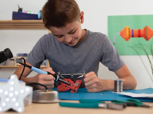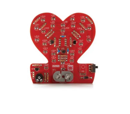 This is a user-interactive soldering kit with blinking red LEDs arranged in a heart shape. It can detect your presence and any movements from a distance. It is equipped with an IR light and an IR receiver.
