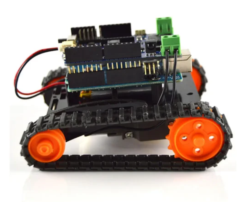 The Mini DFRobotShop Rover Kit (Arduino Uno) is a small, inexpensive tracked platform that provides you with the basic tools needed to experiment with Arduino based programming and mobile robots. This kit includes an Arduino Uno microcontroller module. The frame is made of durable laser cut Lexan parts, and the drive system consists of a Tamiya dual motor gearbox (must be assembled according to configuration A) and Tamiya track and wheel sets.
