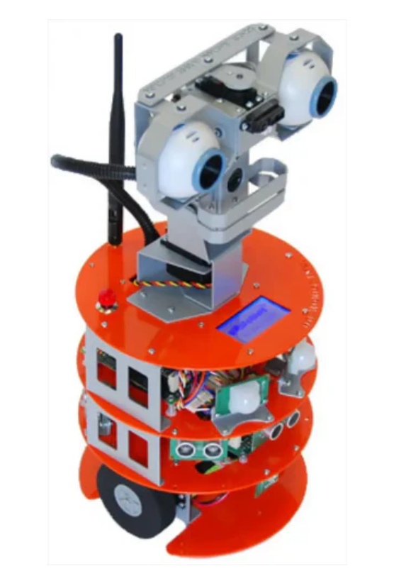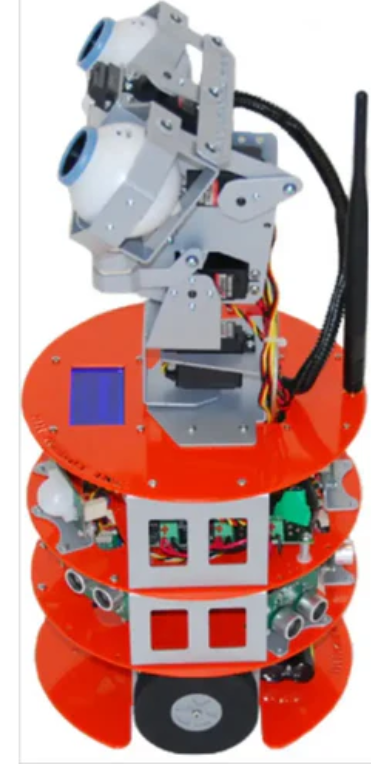 The Dr. Robot DRK8080 WiFi mobile development platform (with header) is fully assembled and ready for immediate use. This WiFi 802.11 wireless mobile animation head system provides complete wireless, multimedia, sensing, and motion functions, and is equipped with various sensors, cameras, and audio modules. The system operates on a wheeled platform, with rotation sensors installed on each wheel to accurately measure and control wheel movement. The mobile animation head system has a total of 7 degrees of freedom, with 5 for the upper head and 2 for the mobile platform. The eyes can be moved and tilted, the eye mask and mouth can be closed and opened independently, and the neck can also be moved and tilted.