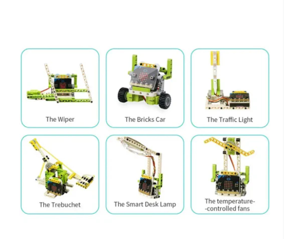 • Children can build 6 shapes, including traffic lights, block cars, temperature controlled fans, smart desk lamps, wipers, and catapults.