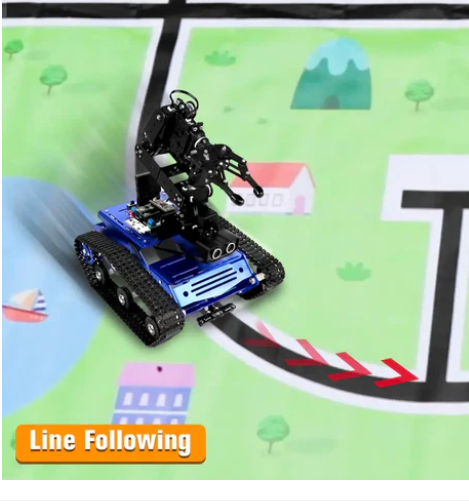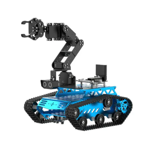 The Hiwonder Tankbot tracked robot vehicle (with a robotic arm for STM32 programming) is an intelligent handling robot driven by an STM32 microcontroller. It is equipped with a robotic arm with six degrees of freedom and uses intelligent serial bus servo. Tankbot can be controlled through the use of applications, controllers, or motion sensing gloves.