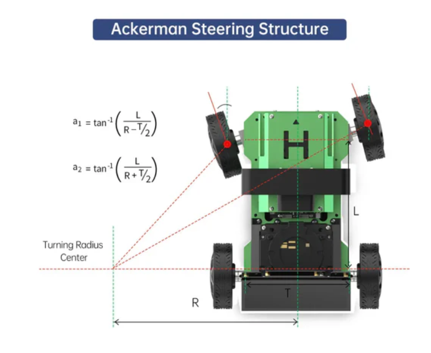 The rear wheels of the chassis are always in a parallel state. When turning, the rotation angle of the inner wheel is greater than that of the outer wheel. Using the difference in rotation angle between the inner and outer wheels for steering is called Ackermann steering.