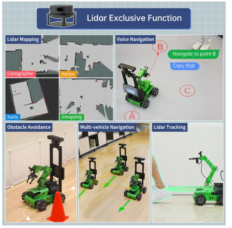 3) Equipped with LiDAR and supporting SLAM mapping navigation