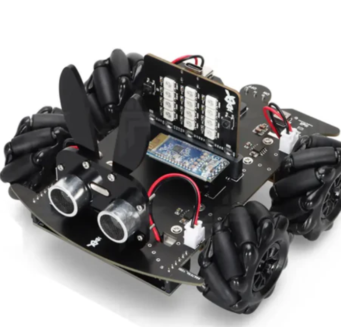 This kit supports multiple functions, including 360 degree omnidirectional movement, ultrasonic obstacle avoidance, and RGB lighting. It is compatible with Android smartphone applications and allows for BLE wireless control. The design of the robot includes a charming rabbit shaped ultrasonic bracket, adding fun to the learning experience.