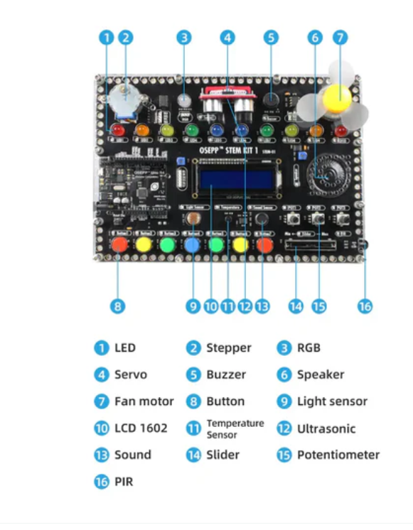 OSEP Stem Kit 1 is the ultimate tool for anyone learning coding. Whether you are in elementary school, college, parents, teachers, or grandparents, you can learn to code using Arduino language. Absolutely no experience is required. Used together with OseppBlock integrated development environment (IDE),