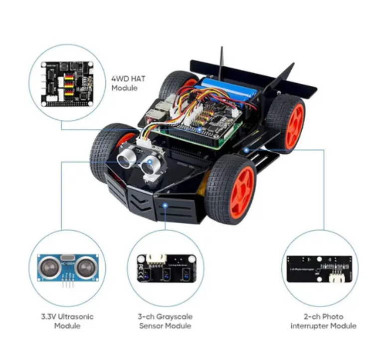 Through the grayscale module, ultrasonic module, and light interception sensor module, the car can achieve functions such as obstacle avoidance, line patrol, following objects, cliff detection, speed measurement, and mileage calculation.