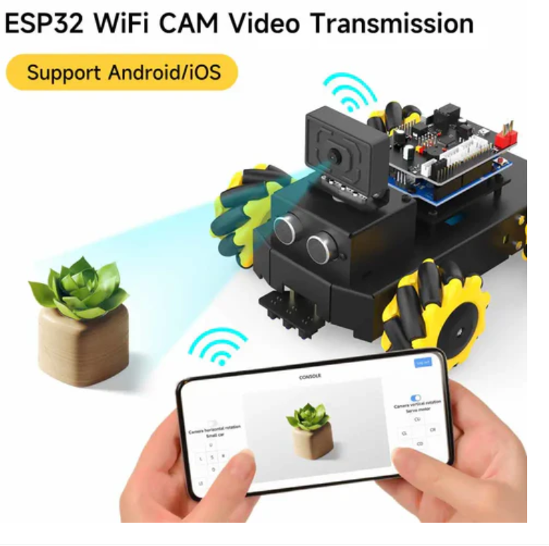 Built in ESP32 WiFi camera module, with built-in WiFi hotspot. Connecting to this hotspot allows real-time viewing of images captured from the robot's perspective through a mobile app, and real-time control of the car's movement and camera pan tilt.