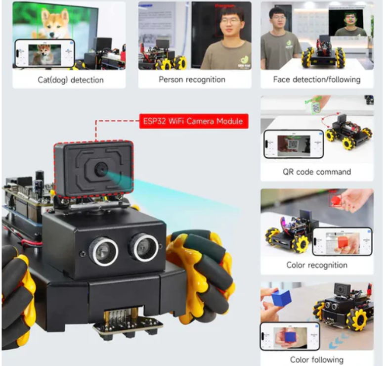The ESP32 WiFi camera module is equipped with a built-in color threshold segmentation algorithm and lightweight convolutional neural network, which helps the car achieve recognition and detection functions such as color, face, QR code, etc.