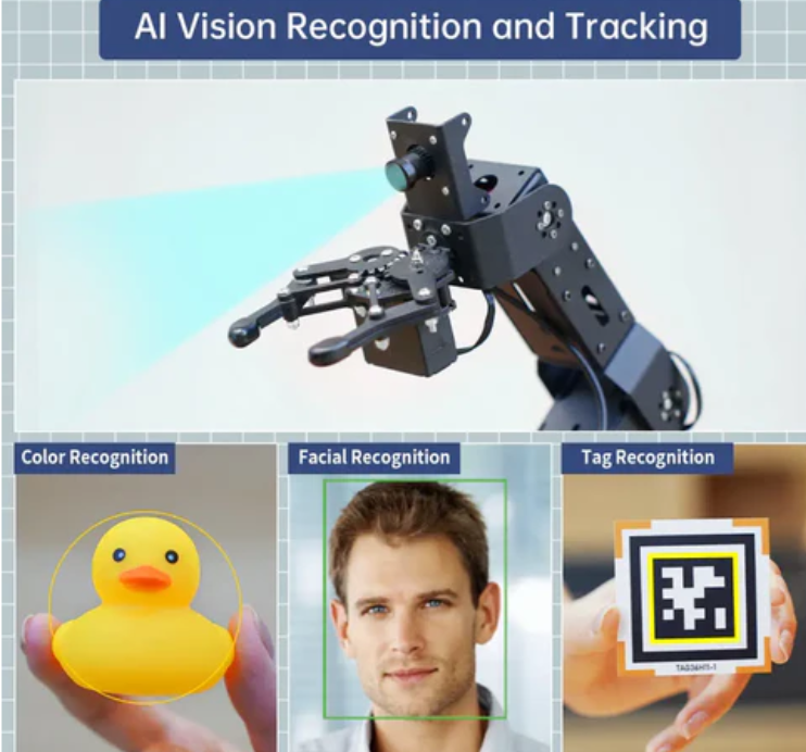 Loading a 5DOF artificial intelligence visual robotic arm to achieve precise positioning, tracking, picking, classification, and stacking of target objects