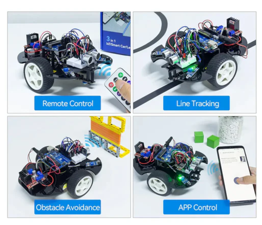 • The SunFounder 3-in-1 Starter Kit is compatible with Arduino IDE and Scratch, and is suitable for beginners and experienced software engineers. With this kit, you can learn how to build and program a multifunctional smart car. It includes features such as line tracking, obstacle avoidance, remote control, etc.