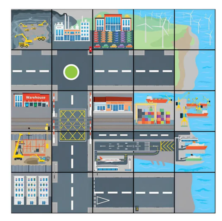 Transportation and Industrial Mat - Drive Bee Bot to explore the town and explore different forms of transportation and industry! As a part of the Bee Bot world, this mat, combined with three other mats, brings even greater challenges! Suitable for Foundation and KS1