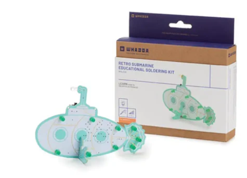The Whadda Retro Submarine Educational Soldering Kit (WSL223) is an educational DIY project that requires soldering. Soldering is a technique used to connect electronic components. Soldering this kit is easy and fun, and you will learn more about electronics in the process. When you are finished, the LED on the kit will light up and you will have a neat little tool. This particular kit is shaped like a Jules Verne style submarine and can be hung by the small mounting holes on the top, or it can stand on its own.