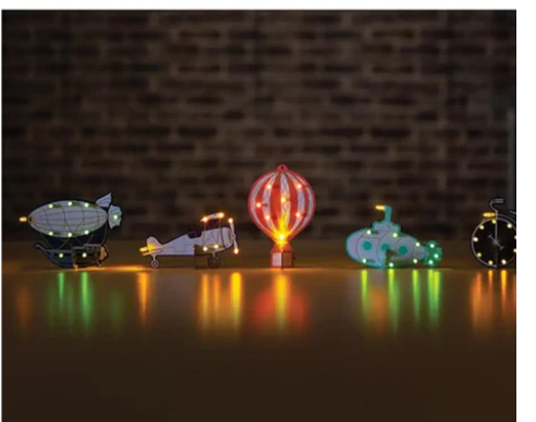 This particular kit is shaped like a Jules Verne style bicycle and can be hung by the small mounting holes on the top, or it can stand on its own.