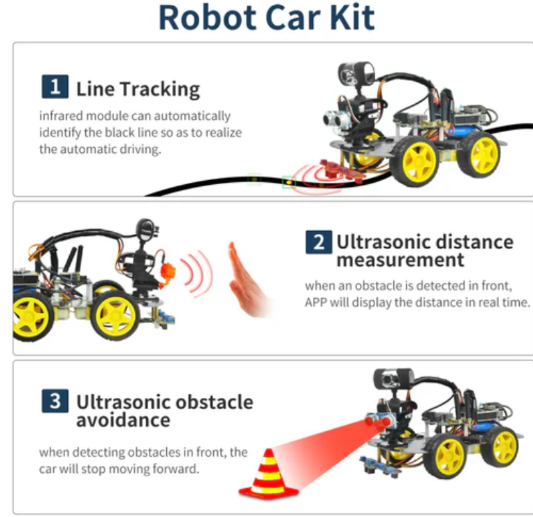 로봇 소형차 키트는 초음파 장애물 회피, 초음파 거리 측정, 적외선 인식 흑선 자동 전진, 로봇 시점 실시간 동영상, WiFi 제어, Bluetooth 제어를 실현할 수 있는 다양한 모듈식 구성 요소를 포함하고 있다.