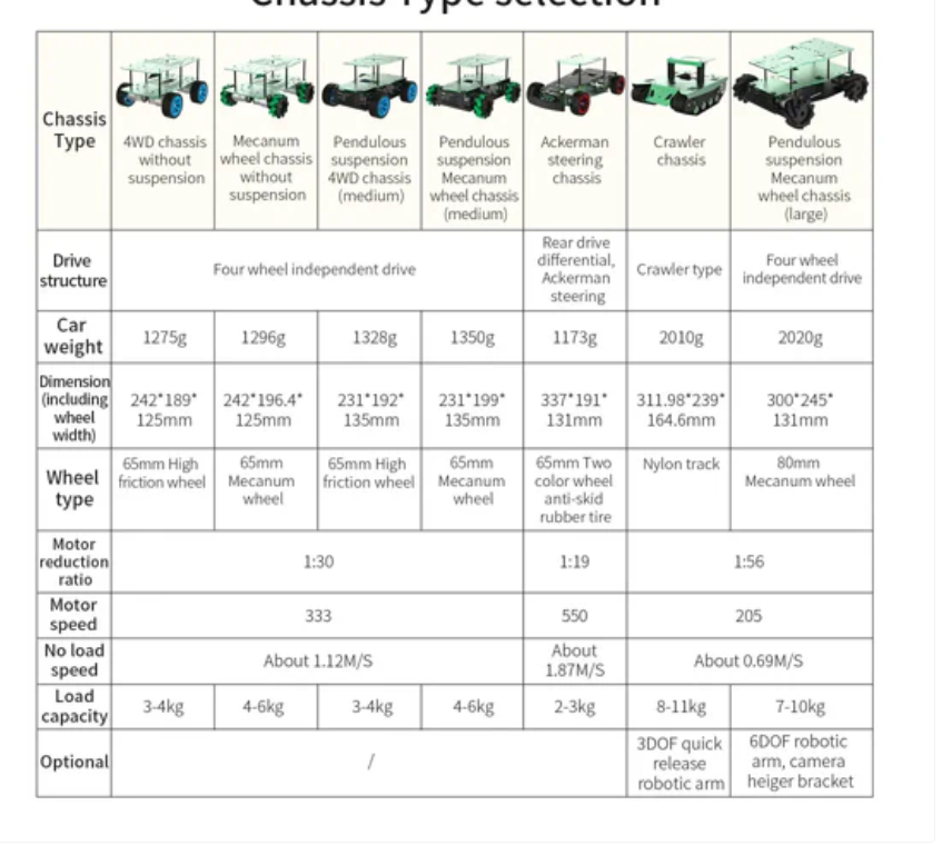 The robot chassis platform is made of high-strength aluminum alloy metal oxide spray paint material, ensuring its durability and sturdiness. It is equipped with 520 encoder speed measurement motors with high accuracy. Each chassis kit has different motor ratios, making it easier to control the speed of the car and the direction of the robot's travel.