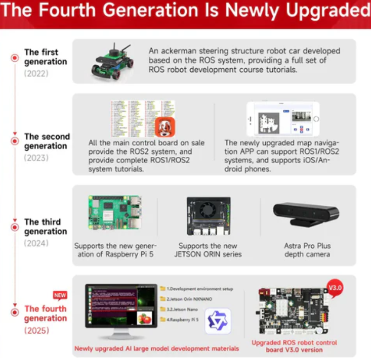 1. Rosmaster R2 has 3 versions (Standard, Superior, Ultimate) that can be used with 4 development boards (Raspberry Pi 5, Jetson Nano 4GB, Jetson Orin NANO, Jetson Orin NX)