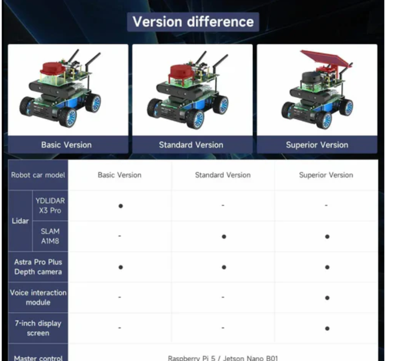 4.다양한 계층 사용자의 요구를 충족시키기 위해 Yahboom은 다양한 버전 선택을 제공합니다.실제 상황에 따라 마스터 대시보드가 필요한 버전을 주문하십시오 (주: 개발판이 없으면 로봇이 작동할 수 없습니다), 부품 선택은 상세한 소개를 참고할 수 있습니다.