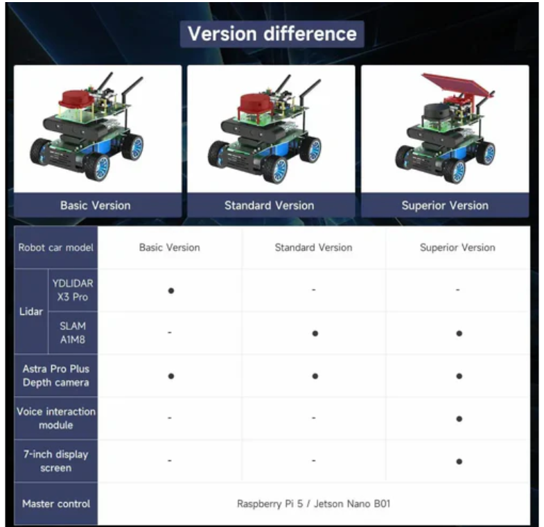 4. In order to meet the needs of users at different levels, Yahboom offers multiple version options. Please order the version with a main control board according to your actual situation (note: without a development board, the robot cannot work). For the selection of accessories, please refer to the detailed introduction