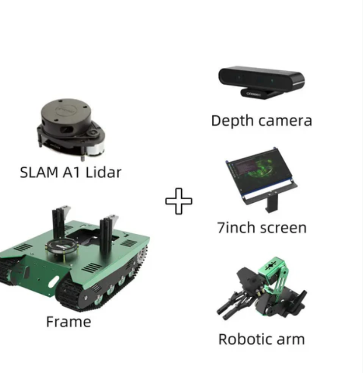 The whole vehicle is made of green aluminum alloy oxide material and supports the installation of mechanical arms, 2DOF camera gimbal, 7-inch screen, etc.